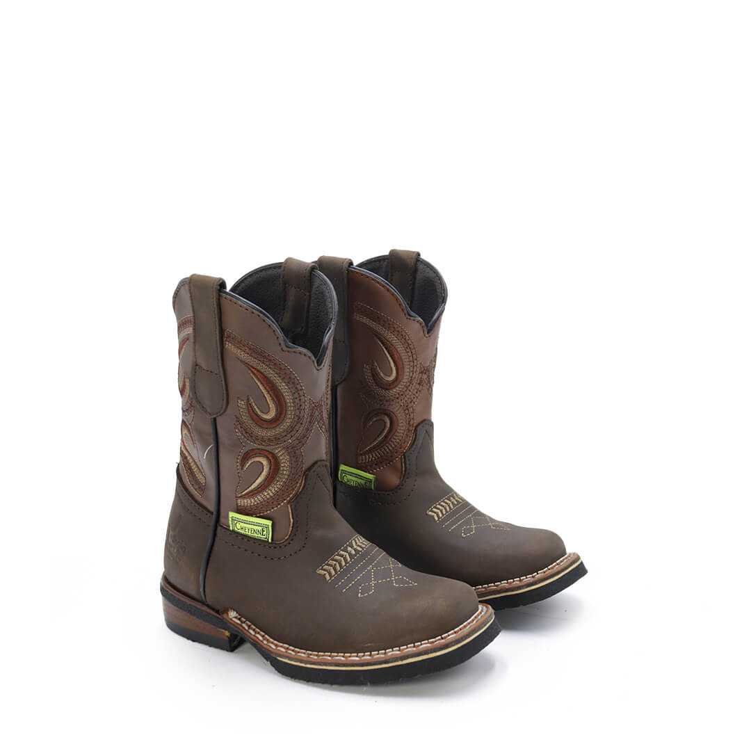 Te presentamos nuestra Bota Rodeo Trebol con horma cuadrada para niño, fabricada en piel vacuno crazy con tubo sintético. Su diseño combina estilo y durabilidad, con una suela de Hule y tacón de PVC duro que garantiza comodidad durante todo el día.